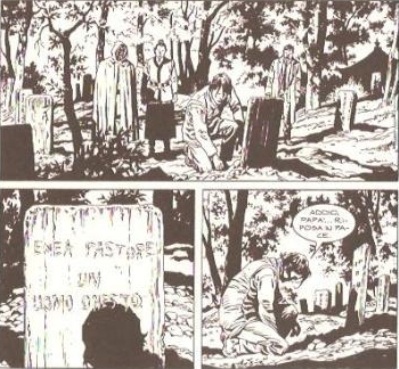 Ugo Pastore come Magico Vento: saluta definitivamente il padre, vedendo il suo spirito, come Ned Ellis si accomiatò dal suo maestro, lo sciamano Sioux Cavallo Zoppo, in Magico Vento n.6. - Pag.52, svelata l'identità di