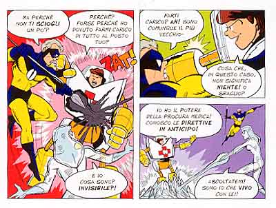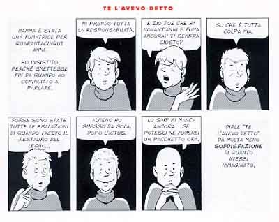 Insomma, a onta dellimmagine ospitata in copertina, si riesce a sorridere leggendo Moms cancer; talvolta con una smorfia amara, ma, come vuole con forza la Vita, si sorride. E lo si fa anche grazie a delle soluzioni grafiche fortemente impregnate di quellironia di cui si parlava e il cui effetto è per alcune tavole (poche in verità) accentuato dalla colorazione. E sapendo di fare una scelta scontata segnaliamo in tal senso quelle che vedono i tre fratelli (lautore con le due sorelle) trasformati in supereroi che combattono tra loro scaricandosi le reciproche tensioni e preoccupazioni (pagg. 41-44). Non meno efficaci appaiono altre che si esauriscono nello spazio di una tavola fulminando il lettore con la loro perfetta sintesi: è il caso de "Te lavevo detto" (pag. 26), ma anche "Natura morta in grigio e nero" (pag. 33) o ancora "Chemio-pancetta" (pag. 38). Queste in particolare - accanto a un approccio che privilegia i soggetti e sfuma gli scenari - ne rivelano la loro destinazione prima, quando ancora Fies, nel pubblicarle online, non sapeva se il cancro che aveva colpito la madre sarebbe stato sconfitto o meno, né che Moms cancer sarebbe diventato anche un fumetto cartaceo. E, pur modificando il ritmo della lettura, esse si inseriscono armonicamente allinterno di un insieme che nasce, tavola dopo tavola, come cronaca sincera di un evento terribile e destabilizzante e ignoto nelle sue conclusioni.