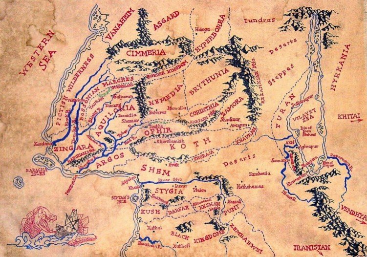 Importantissimo è l'universo in cui Conan si aggira: Howard stesso fornì ai lettori un numero notevole di cartine da lui stesso disegnate in cui i vari regni sono distribuiti su un continente che per forma e per distribuzione etnica assomiglia al blocco afro-euroasiatico. Cimmeria, il regno in cui è nato Conan è a nord, sopra Aquilonia, la nazione più potente dell'era Hyboriana. Ma ci sono anche Hyperborea, Nemedia, Brytunia, Stygia e tantissimi altri stati governati da re crudeli. Howard non lascia nulla a caso e ogni popolo ha la propria mitologia. Quella di Conan è semplice ed è alla base della morale di Conan: Crom è il capo di tutti gli dei. Oscuro e selvaggio lancia sciagure dalla cima della montagna in cui vive in quanto odia i deboli. Ma dona a ogni nato la forza, il coraggio e la volontà per uccidere i propri avversari. Da qui è facile comprendere l'atteggiamento di Conan nei confronti di un'epoca in cui la corruzione e la decadenza regnano sovrane. L'artista dipinge una serie di illustrazioni eccezionali per dinamismo e potenza riuscendo a infondere l'essenza della narrazione di Howard. A seguito di questo rinnovato interesse si colloca il terzo e definitivo passaggio. Nel 1970, nel tentativo di cavalcare il successo del filone narrativo dell'heroic fantasy, Roy Thomas, incaricato dalla Marvel Comics, contatta l'agente di Lin Carter per lo sfruttamento dei diritti di un suo personaggio.