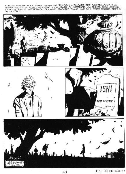 Un'ipotesi alternativa sull'epilogo di "Faccia di Rame" ...ovvero: come fare per far uscire Ken Parker di prigione ;-) di Francesco Manetti Con lo speciale n.4, "Faccia di rame", ha fine ancora una volta la vita editoriale di Ken Parker. Per convenzione, almeno nelle attese del lettore comune, la chiusura di una serie dovrebbe corrispondere con un epilogo significativo delle vicende del personaggio protagonista, se non addirittura con la sua morte. Tanto per restare in casa Bonelli, la chiusura della serie "Il piccolo Ranger" coincise, ad esempio, con la decisione di Kit Teller di abbandonare l'esercito, così come l'ultimo albo de "Il comandante Mark" coincise con la conclusione (alla buon'ora ;-) della guerra di indipendenza americana. Niente di paragonabile avviene, almeno apparentemente, in quest'ultimo albo di Ken. "Faccia di rame", infatti, si presenta come uno dei racconti retrospettivi che Ken ha iniziato a scrivere per conto dell'editore newyorchese Ned Buntline (cfr."Il grande spettacolo", c3b), ovvero come un'avventura da situare necessariamente prima del suo arresto. Quel lettore che si chiedesse qual è l'ultima avventura di Ken non potrebbe dunque che essere rinviato alla (ri)lettura de "I condannati" (sp1), dato che anche "Ai tempi del Pony Express" (sp2) racconta una storia retrospettiva e che ne "Le avventure di Teddy Parker" (sp3) Ken non compare neppure (fatta eccezione per un flashback). La serrata continuity della serie si concluderebbe, in altre parole, con un Ken rassegnato a scontare la propria pena nel carcere di Fort Lauderdale, in mezzo alle paludi della Florida (cfr., per quanto riguarda la rassegnazione di Ken dinanzi al proprio destino, la sua conversazione con Hamilton alle pag.136-137 del primo speciale). Una conclusione amara, e a dire il vero anche abbastanza deprimente, ma che siamo costretti ad accettare, benché sia ovvio che Berardi, facendo muovere Teddy e Lita verso la Florida, avesse senz'altro in mente chissà quali altri sviluppi... Poiché la speranza è l'ultima a morire, si sono comunque create delle voci di corridoio secondo le quali sarebbe attualmente in lavorazione (o sarebbe comunque in fase di progettazione) un albo effettivamente conclusivo della serie. A mio parere, si tratta di una speranza del tutto vana. A prescindere da quel che potrà avvenire in un futuro più o meno lontano, per il momento Milazzo è infatti impegnato nella realizzazione di un Texone (vedi l'anteprima di due sue tavole), lavoro che lo terrà senz'altro occupato a lungo, mentre Berardi è a sua volta impegnato nella stesura delle sceneggiature di Julia, il suo nuovo personaggio che dovrebbe "debuttare" entro pochi mesi. E' possibile, però, che Berardi, ormai consapevole dell'imminente chiusura della testata, non abbia saputo far altro che propinarci una storia come tante altre? E' possibilissimo, e personalmente non me ne stupirei più di tanto, visto anche con quale storia interlocutoria ("Un alito di ghiaccio", n.61b) Berardi interruppe, nel gennaio del 1988, la saga di Ken Parker... Eppure, al tempo stesso, perché non supporre che Berardi abbia comunque trasformato almeno in parte la sceneggiatura di "Faccia di rame" in modo da poter offrire ai suoi lettori, in un certo qual modo, un appiglio che consenta loro di immaginare una conclusione alternativa alle vicende di Ken? Leggendo "Faccia di rame" sono rimasto colpito dalla datazione della storia. Essa ha inizio nell'estate del 1878 (pag.15), quando Ken, lavorando come guida per due strambi ingegneri, incontra per la prima volta Ishi. "Tre o quattro anni più tardi" (pag.35) Ken si trova a passare da Oroville proprio nel momento in cui Ishi subisce un tentativo di linciaggio da parte degli abitanti del paese. Entrambi rimangono a Oroville, ospiti di Duke Shaw, "per più di un anno" (pag.190), dopodiché Ishi si trasferisce con Joan e Claude a San Francisco, dove muore di tubercolosi a circa cinque anni di distanza (pag.193) dal suo arrivo a Oroville. "Molto tempo" dopo (molto tempo dopo, ribadisco) Ken, passando per San Francisco, rende omaggio alla tomba del suo amico (pag.194). Dalla prima alla penultima tavola dell'albo trascorrono dunque non meno di otto anni, il che significa che Ken si trova dinanzi alla tomba di Ishi in un anno sicuramente successivo al 1886. Ora, qualunque lettore della serie può facilmente constatare, in base a tutta una serie di indicazioni disseminate in molti albi, che Ken viene arrestato da Bruce Lusky (cfr."L'arresto", c6b) nel corso del 1882 o, al massimo, nei primi mesi del 1883. Ne consegue che la datazione della storia narrata da Ken in "Faccia di rame" entra in palese contrasto con la cronologia di tutti gli albi precedenti: Ken si ritrova a Oroville, in California!, negli anni in cui dovrebbe trovarsi in Canada, braccato dalla legge, o peggio ancora in prigione. Ma ne consegue anche, per quanto ciò possa apparire assurdo, che il Ken dell'ultima tavola di "Faccia di rame" è il Ken più "vecchio" che ci sia dato di conoscere e che Berardi, con quest'ultimo albo della serie, ci viene di fatto a regalare l'immagine di un Ken "libero", di un Ken uscito chissà come di prigione, di un Ken che, alla fine degli anni '80, continua a vagabondare e a vivere nuove avventure (che Berardi non ci racconterà probabilmente mai). Io non credo, quindi, che a "Faccia di rame" farà seguito un episodio nel quale Teddy e Lita raggiungeranno Ken e nel quale Ken evaderà o morirà o accadrà chissà cos'altro. Tutto è possibile, ovviamente, anche che Berardi stia effettivamente già fantasticando questa nuova storia o che, magari fra vent'anni, egli possa decidere di riprendere in mano il suo personaggio per condurlo a chissà quale destino... Per quel che mi riguarda, io osservo l'ultima tavola dello speciale e trovo che essa, coerentemente con una lettura "poetica" della serie, è un commiato stupendo fra Berardi e Milazzo (e Ken) e i kenparkeriani più affezionati... Io interpreto quell