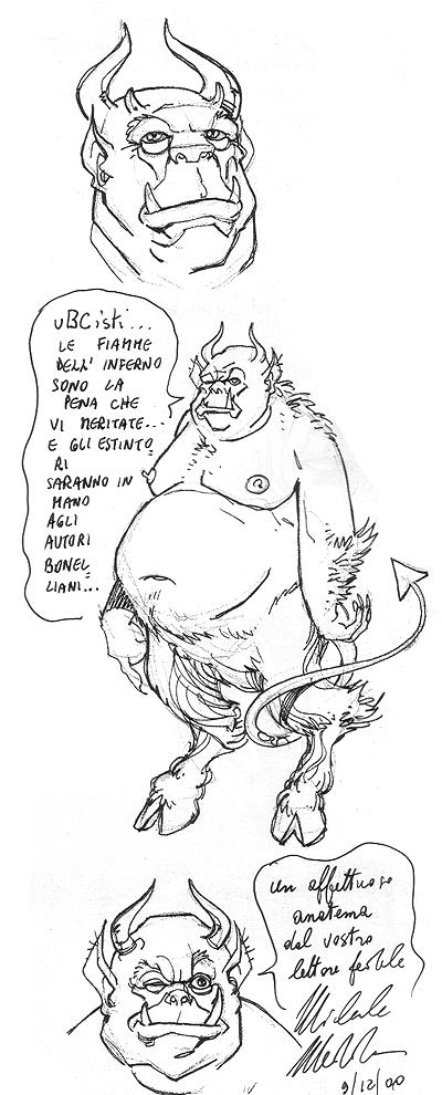 Parlando di velocità: Casini disegna velocemente? Smitizziamo anche questa diceria. Bisogna ammettere che fa le sue 20 tavole al mese - si narra che Serra sia sommerso da queste tavole fino all'esasperazione - ma c'è chi ne disegna di più. Brindisi ne realizza 30 e De Angelis arriva addirittura a 40 tavole al mese. Gli piacerebbe fare anche un western - alla Peckimpah - e si sentirebbe più vicino a Magico Vento che a Tex (dei disegnatori predilige Ticci). Ha già realizzato alcuni disegni di prova con Magico Vento e Poe e non ha avuto difficoltà neppure provando alcune tavole di Blizzard (MV 15). Anche Castelli gli ha promesso una storia di Martin Mystère ma la cosa sta andando per le lunghe... Al di fuori della Bonelli, a marzo dovrebbe uscire "Il buio alle spalle", pensato su mezze tavole alla francese, edito da Alessandro Distribuzione, già come Il demone nell'anima e distribuito a livello europeo. CONCLUSIONEAl termine dell'incontro Medda rivolge una piccola critica a uBC per quelle segnalazioni di incongruenze troppo ricercate che non prestano attenzione a ciò che veramente l'autore vuole esprimere. Ma da nostro buon lettore ci scrive una scherzosa dedica per tutto il nostro staff, usando i disegni di Casini presenti sul volume.