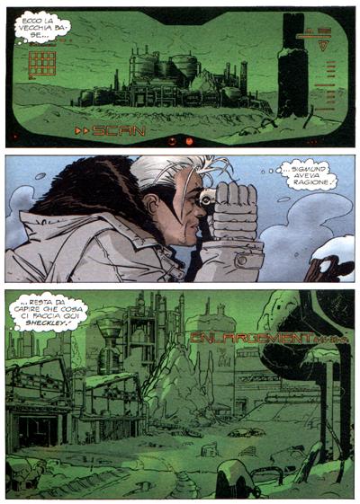 Grande De Angelis come al solito! Ma questa volta ci sentiamo di muovere una piccola critica: l'ambientazione realizzata da De Angelis è sempre meno "fantascientifica". In questo numero si è toccato il massimo: le automobili sono quelle che potreste vedere uscendo di casa (guardate pag.56 o pag.74), l'architettura è quella del nostro tempo (pag.29o pag.66), gli interni sono in stile anni '90 (pag.22, pag.26, pag.29, ...), le armi hanno di strano solo qualche display (immancabilmente a fosfori verdi come tutti gli schermi! :-).