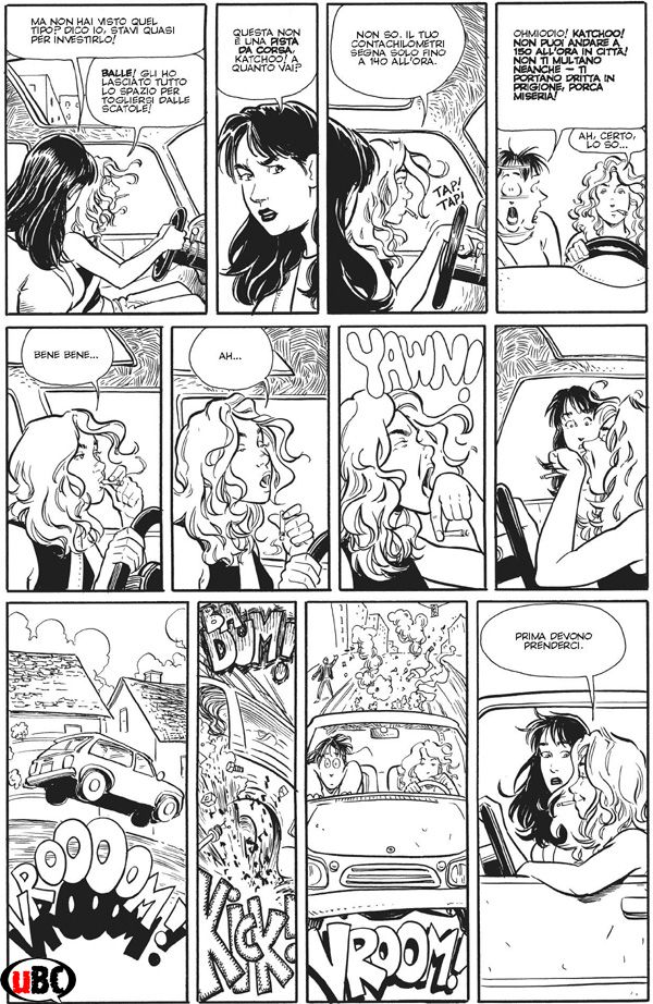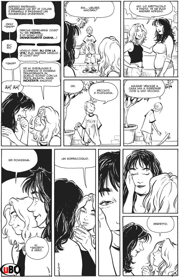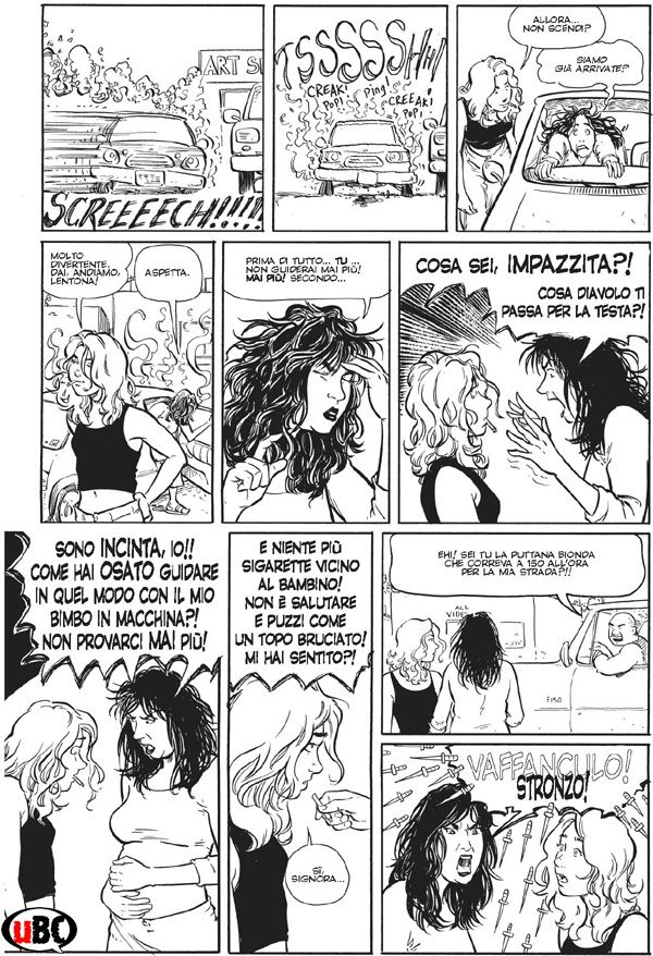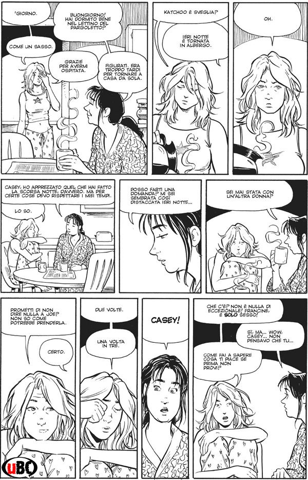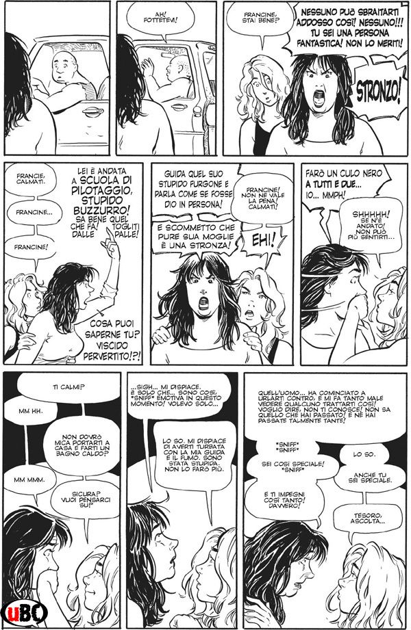 Intorno a queste tre figure ruota tutta una serie di altri personaggi (Freddie Femur, Darcy Parker, Tambi, Casey Femur, solo per citarne alcuni), tutti tratteggiati con minuzia, cosa che li rende sempre dei co-protagonisti e mai delle semplici comparse. Queste poche righe introduttive, tuttavia, non possono assolutamente restituire la complessità di un'opera come Strangers in Paradise", dato che è possibile apprezzare tutte le sfumature di stile pensate da Terry Moore (parti in prosa, canzoni, poesie, giochi ad incastri, ipotesi) solo immergendosi completamente nella lettura. Invitando tutti i lettori a reperire i precedenti albi e a buttarsi nella lettura delle prossime uscite targate Free Books, presentiamo in anteprima le prime 10 tavole tratte da SiP vol.III #50, "Backlash", "Contraccolpo" nell'edizione italiana, uscito negli Stati Uniti nel maggio 2002. Ringraziamo Andrea Materia per la sua disponibilità e consigliamo la lettura della sua intervista per scoprire altre notizie in merito a SiP e alle novità 2005 della Free Books.