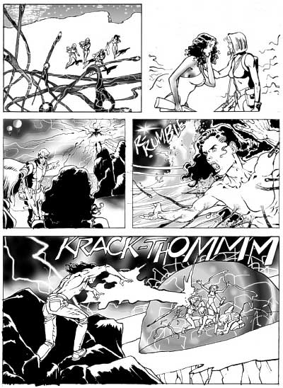 E in aggiunta eccovi in anteprima alcune delle tavole. La prima è realizzata esclusivamente con le tecniche tradizionali e basa la sua efficacia esclusivamente sul netto contrasto dei bianchi e dei neri, mentre le altre, che sono ambientate in una realtà parallela, sono state tutte trattate elettronicamente e dimostrano l'efficacia del metodo descritto.