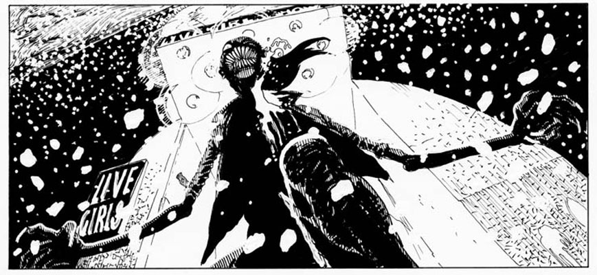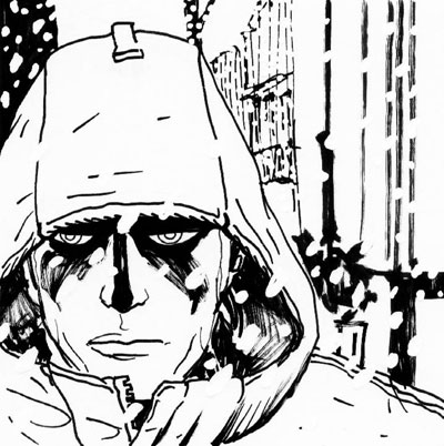 JoachimLeggo la sceneggiatura (Fede mi manda poche pagine alla volta, anche solo una certe volte), butto giù le matite sulla tavola. Le matite sono per me lo scheletro non la tavola da inchiostrare pedissequamente, poi mi riempio la mano sinistra di un grosso fascio di penne graduate e Uni-Posca medi e super-fine e inizio a disegnare veramente la pagina dove dopo passerò con copiose dosi di bianchetto per correggere o fare effetti.