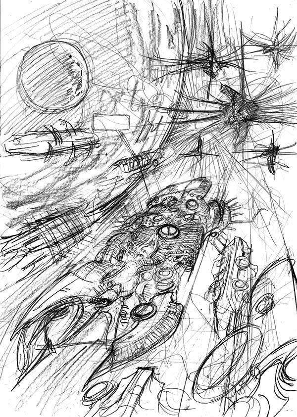 Per realizzare una tavola tendo a fare un layout anche definito a volte... se passa il decoupage, che è molto rilevante nella narrazione francese, di solito non faccio matite definite e vado a china direttamente... definendo, a mano a mano, cose piu complesse.