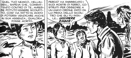 La sceneggiatura è appesantita da dialoghi ridondanti e ingessatiRiguardo alla sceneggiatura, la scrittura di Burattini ha purtroppo segnato un deciso passo indietro dopo Mortimer: ultimo atto e Lo zoo di Kaufman: appesantita da dialoghi ridondanti e ingessati, mostra la nota ed evidente volontà di chiarire ogni minimo aspetto e comportamento, sviscerandolo nei più piccoli passaggi logici. A volte la necessità di fare il punto della situazione è risolto in modo efficace, come nella rievocazione del finale di Magia senza tempo, visto dalla prospettiva del clone di Hellingen che gradualmente recupera i ricordi. Ben più spesso i risultati sono invece infelici: la sequenza del bimbetto indiano da poco orfano che fornisce l'interpretazione corretta della minaccia dietro gli automi a un gruppo di adulti tontoloni, tra cui Zagor, è francamente grottesca e non meno sconfortante delle sequenze in cui l'autore fa un' "invasione di campo" nel racconto, facendo rievocare a Zagor alcune sequenze di storie passate al solo scopo di dire ai lettori ipercritici che un Hellingen razzista e psicopatico è compatibile con le storie nolittiane. In generale sono tutti i personaggi a parlare, dedurre e controdedurre troppo tra di loro, e ogni volta che si incontra qualcuno (ora gli scienziati Hubbard e Kant, ora gli agenti Jesse e Roberts di Altrove, ora il generale Nolan) si riparte da capo. Una simile modalità narrativa può andare bene nel romanzo, ma in ambito fumettistico, in cui immagine e testo dovrebbero essere in equilibrio nel portare avanti una storia, si finisce con l'ammazzare inesorabilmente ogni possibilità di tensione drammatica e di conseguente piacere nella lettura. Come nel primo faccia a faccia tra Zagor e Hellingen nei sotterranei di Altrove: un anticlimax in cui lo scienziato finisce con il ripetere ancora una volta le modalità della sua clonazione, già precedentemente discusse e dedotte allo sfinimento. Non è andata comunque molto meglio nelle parti d'azione, con quel Morirai! ripetuto dagli automi così ossessivamente da dare alle sequenze di battaglia una connotazione quasi puerile.